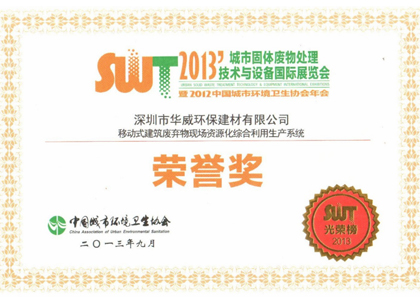 • 城市固體廢物處理技術(shù)與設(shè)備國際展覽會榮譽獎