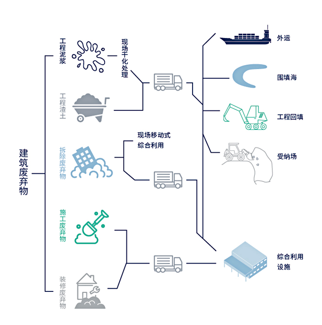 建筑廢棄物根據(jù)組成類別不同可分為工程泥漿、工程渣土、拆除廢棄物、施工廢棄物和裝修廢棄物五類。其中,工程棄土、工程泥漿主要來源于軌道交通工程、道路工程、房屋建筑工程,水務(wù)工程及市政管網(wǎng)工程;拆除廢棄物主要來源于道路工程及城市更新工程;施工廢棄物主要來源于房屋建筑工程,裝修廢棄物主要來源于房屋裝修工程。 深圳市華威環(huán)保建材有限公司圍繞五大類建筑廢棄物開展無害化處理與資源化利用相關(guān)工作。